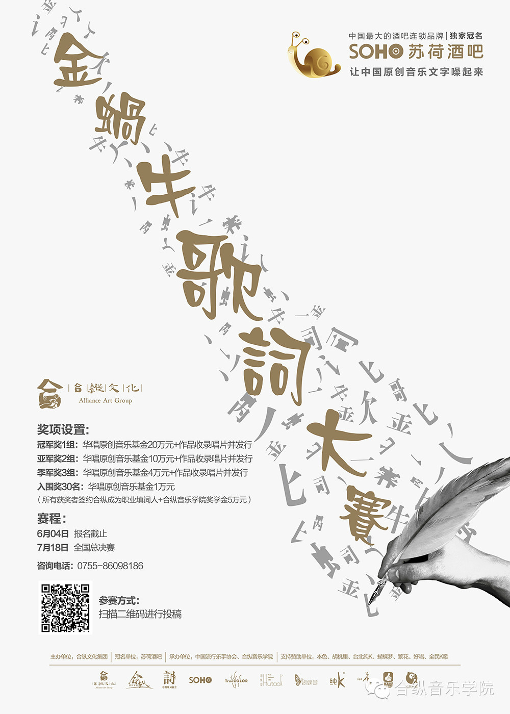 大赛由合纵文化集团主办,亚洲最大酒吧连锁品牌苏荷酒吧独家冠名,中国造星工厂——合纵音乐学院、中国歌词协会、中国流行乐手协会联袂承办。