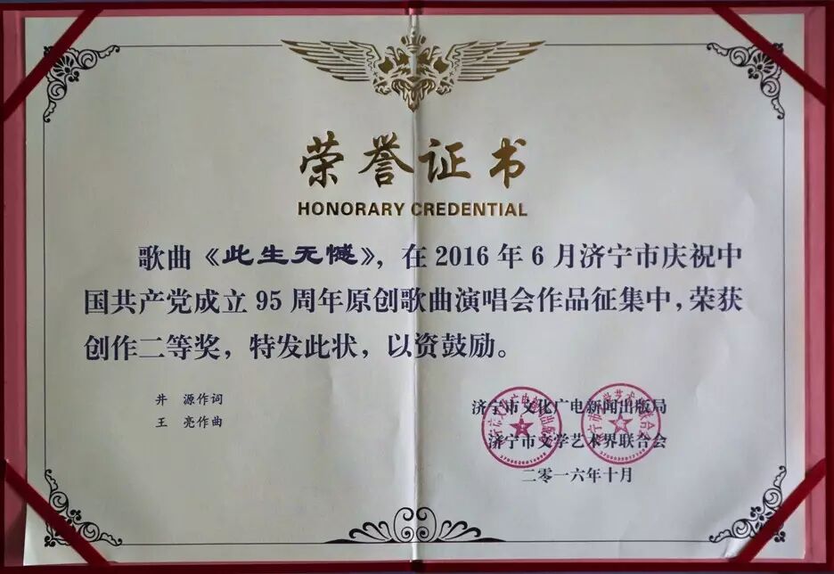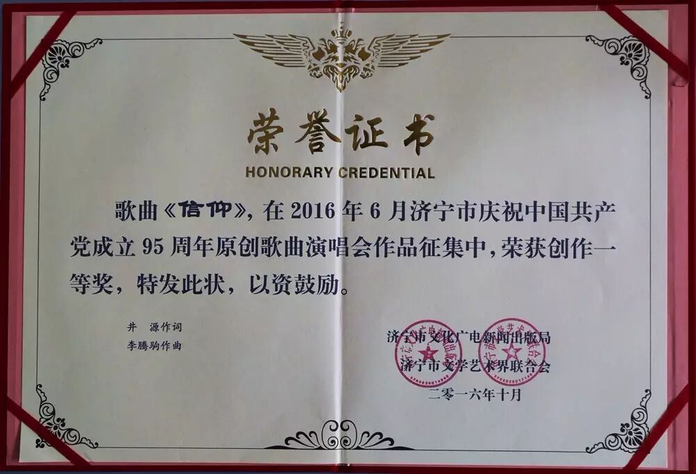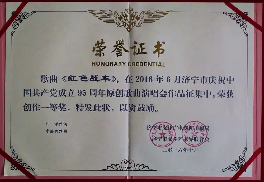 济宁消防原创歌曲《红色战车》《信仰》荣获由济宁市文广新局、济宁市文联举办的“庆祝中国成立95周年原创歌曲演唱会作品征集”活动一等奖;《此生无憾》荣获二等奖。