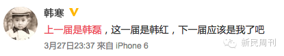 得知韩红夺冠的消息,韩寒还在微博上插一脚:上一届是韩磊,这一届是韩红,下一届应该是我了吧。