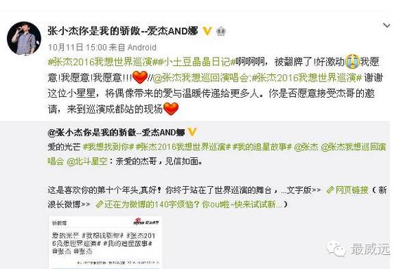 …… 然后我终于考到了你的母校,四川师范大学……是你和娜姐的鼓励给了我力量。你说磨难是最好的礼物,只要坚持,不放弃,就一定能看到希望。娜姐也在微博上为我加油,让我以后一起去看你的演唱会。 是你们的鼓励支撑着我走过了那段最艰难的岁月,我一直记着杰哥说的那句话:不是看到希望才去努力,而是努力才会有希望!