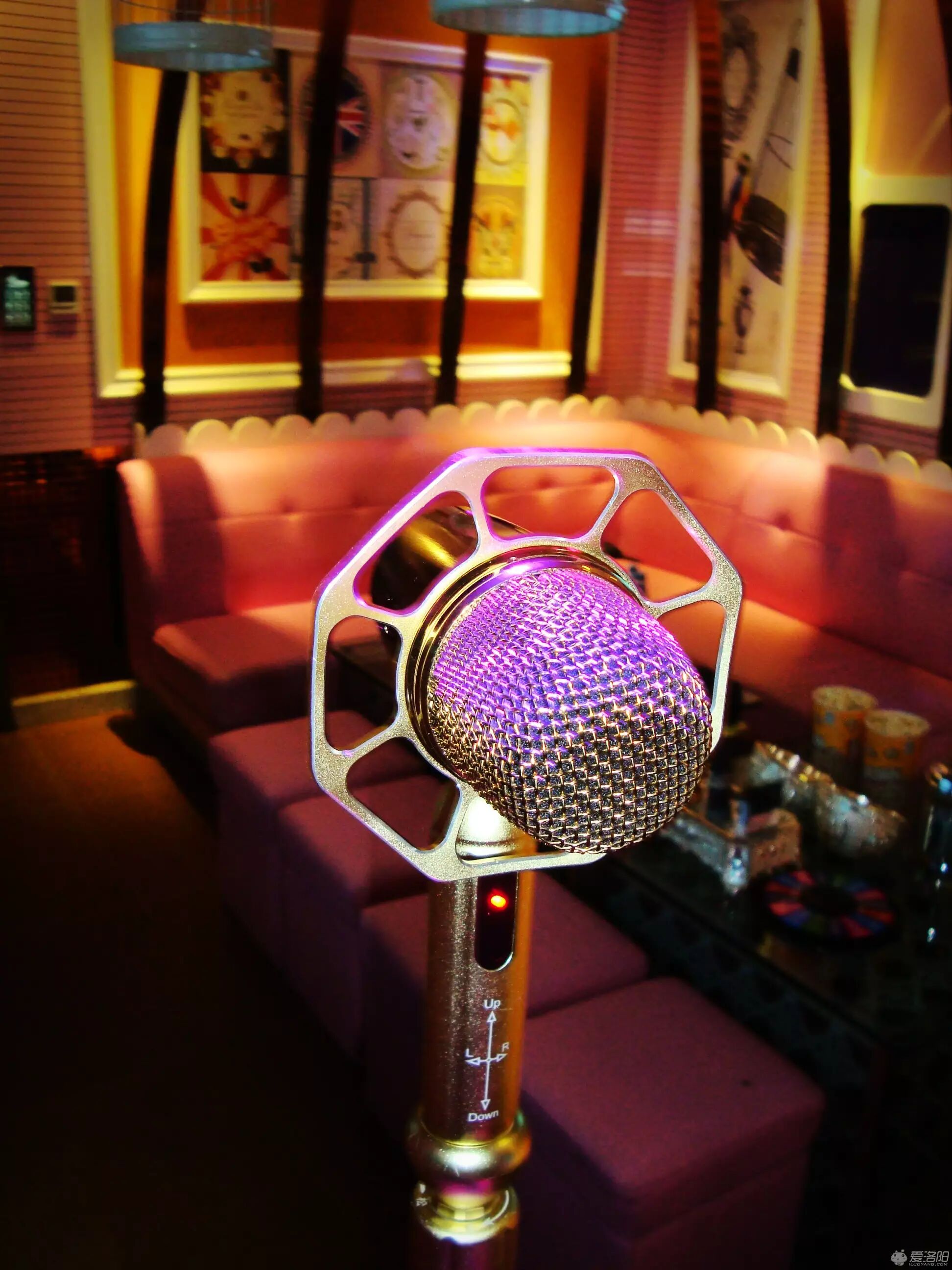 角落的复古立麦和点唱系统,立麦是全金属外壳和红外感应开关。最特别的是尾部有动感灯光,会随着音乐节奏闪动。