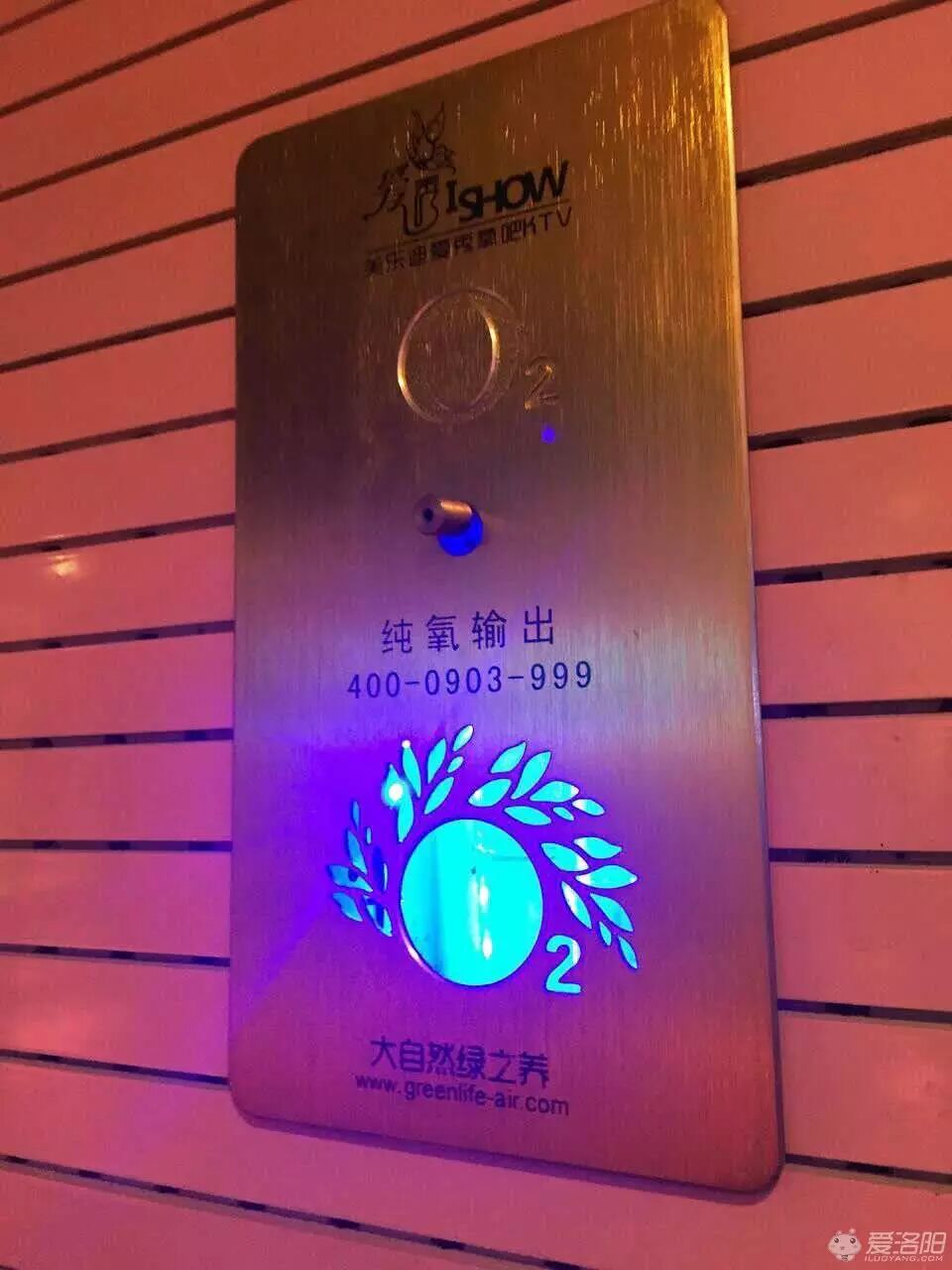 墙上的纯氧输出标识,在封闭的KTV空间中,不间断的少量纯氧供应可以有效提高空气质量,对人的呼吸系统很好。