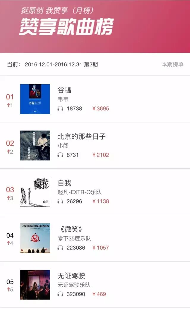 「中国原创音乐 · 赞享榜」月榜-2016年12月