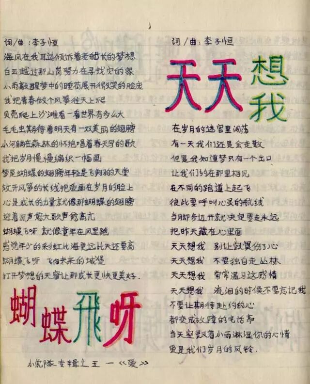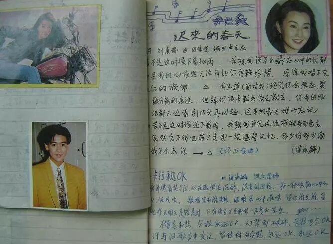 那时抄写的歌词来源于购买磁带里面带的写真或是电视, 那时我们抄歌的本都是用笔记本,不同的笔迹,不同的方格,不同的抄写方式表达着相同的情感。