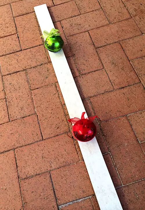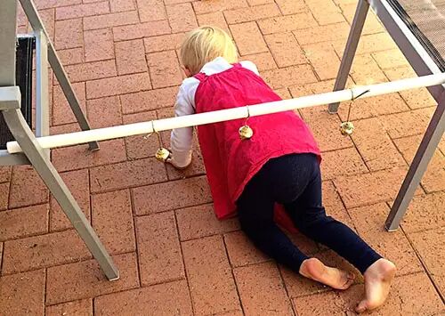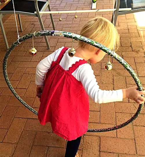 1、不要碰到圣诞铃铛。在呼啦圈和棍子上系圣诞铃铛,设置一些障碍物,让小朋友来走障碍!来,比比看,谁能不碰到圣诞铃铛就可以一次通过!