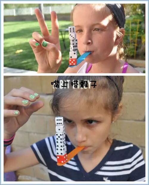 2、嘴上搭骰子。嘴里咬住冰棍棒,将骰子搭在棍的另一端,比比看,谁搭的最高