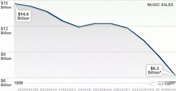 1983 年之后,全球的 CD 销量连续 17 年增长,在 2000 年达到 24.5 亿张的顶点,此后便一蹶不振开始下滑。到 2009 年,美国音乐产业的规模从 1999 年的 146 亿美元下滑到仅剩 63 亿美元。