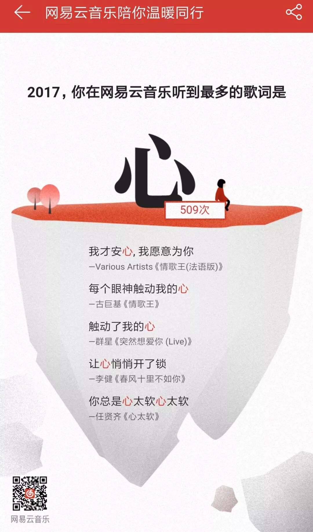 “2017,你在网易云音乐听到最多的歌词是心,509次”
