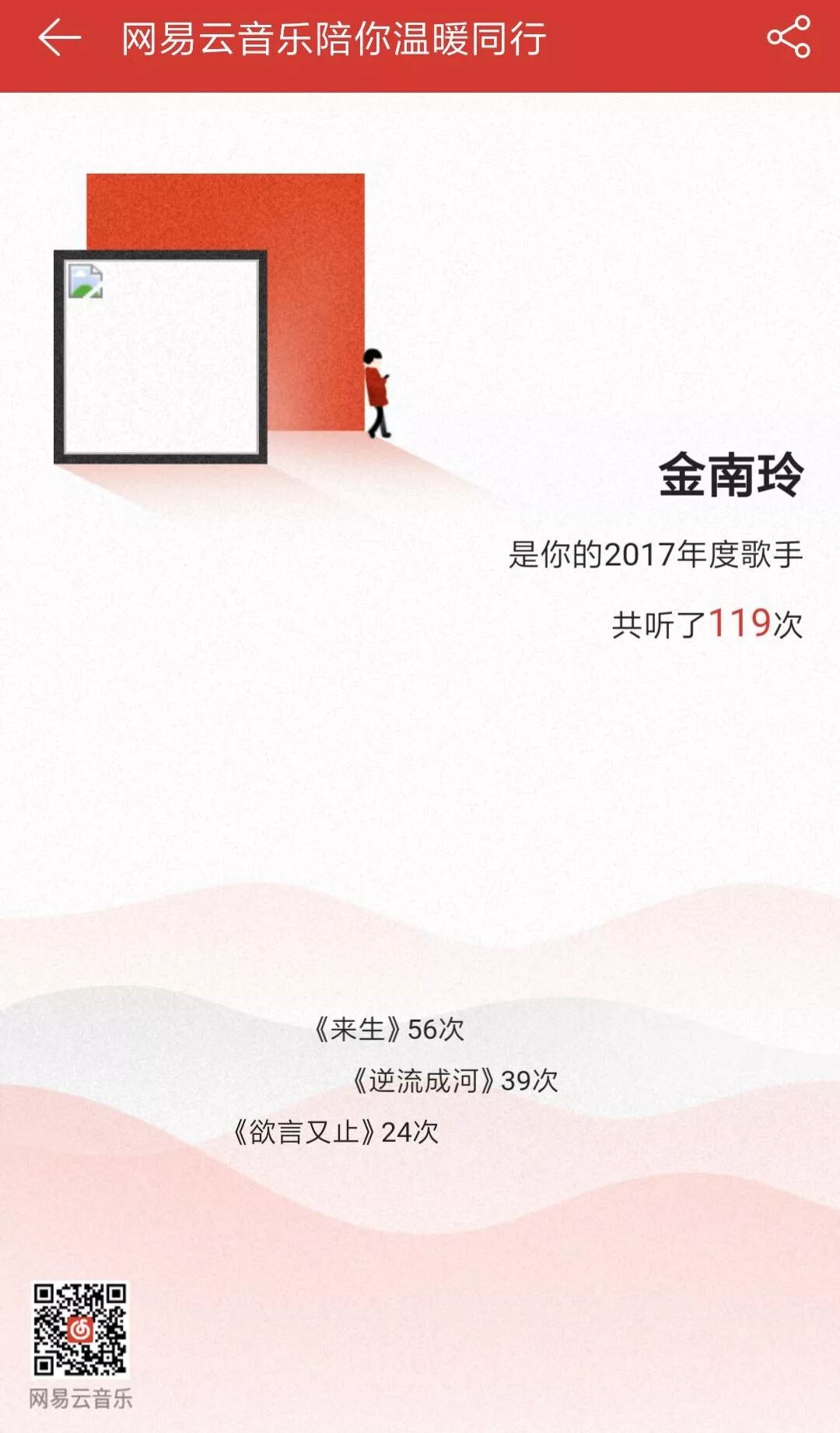 “金南玲,是你的2017年度歌手,共听了119次,《来生》56次,《逆流成河》39次,《欲言又止》24次”