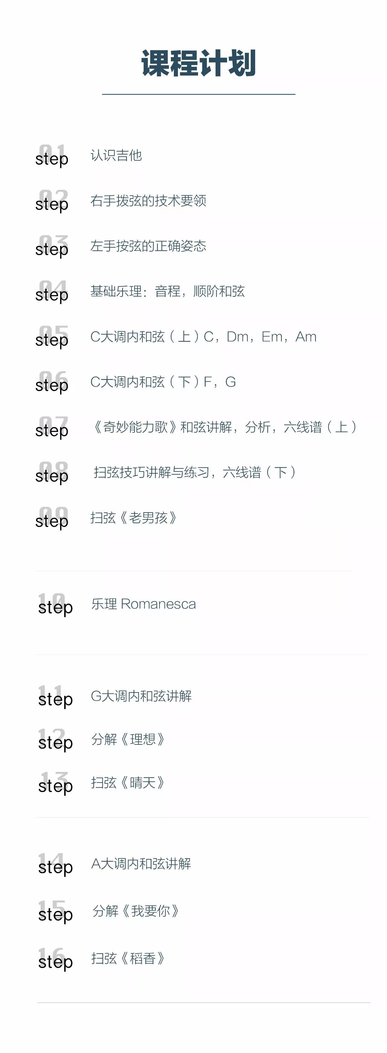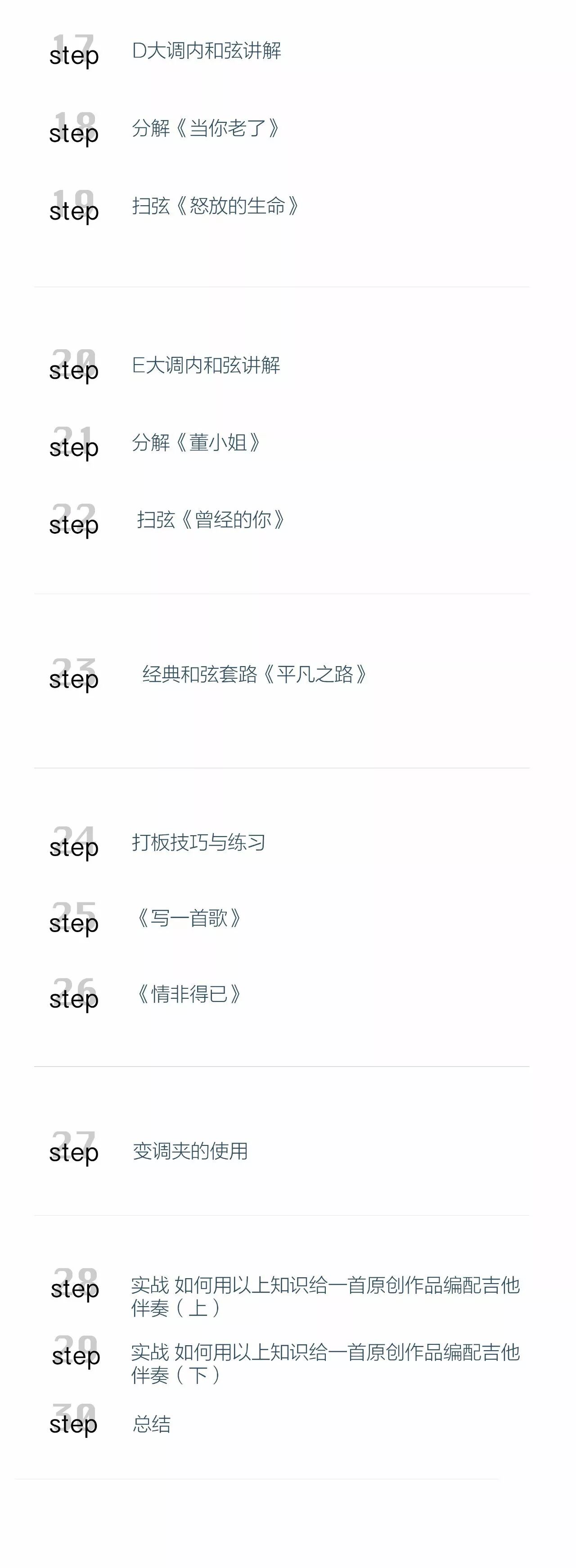 徐又老师共讲解了30篇关于吉他的知识技巧和经验,另附赠7篇有趣的番外知识!这37节课程包括:充满趣味的基本功练习;最规范的弹琴方法及姿势;识谱;节奏;基础乐理;各个调的调内和弦;丰富全面的分解和弦和扫弦节奏型;左右手技巧... 每节课以一首典型歌曲为例来进行深入的学习,比如: