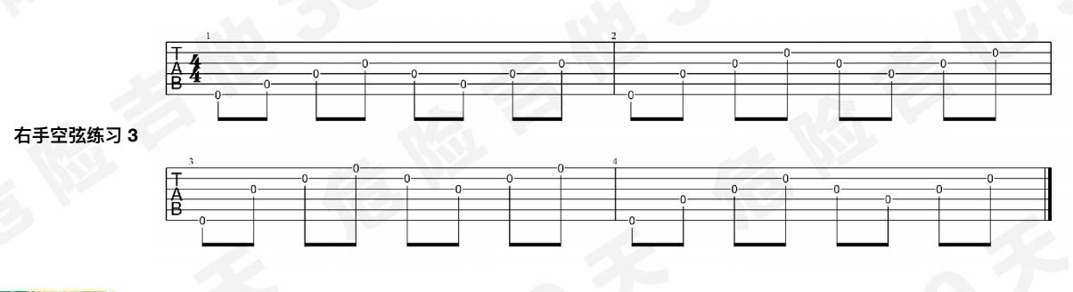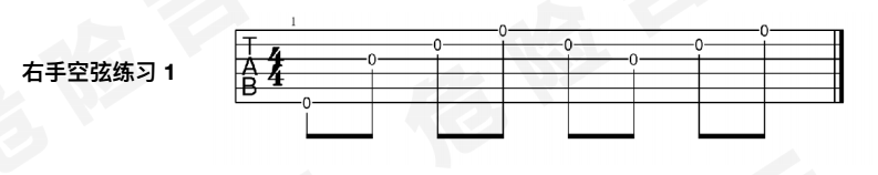 右手的空弦训练强化右手的正确姿势,使手指熟悉每根琴弦之间的距离和位置。