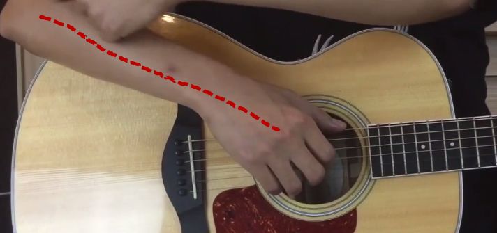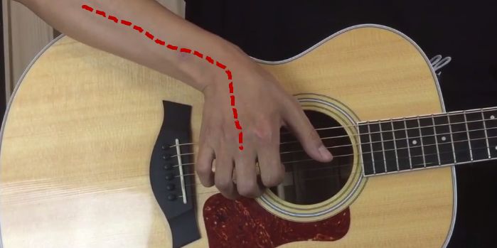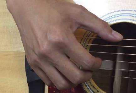 放在音孔后半段和琴桥之前的区域手型半握拳,大拇指方向是食指的第一关节,但是不要捏紧。稍微打开点,放在琴弦上。