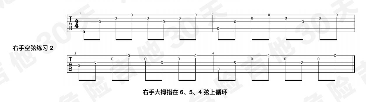这条练习1有一个变体,就是我们让大拇指在4弦、5弦、6弦之前循环弹奏,就变为下图练习2