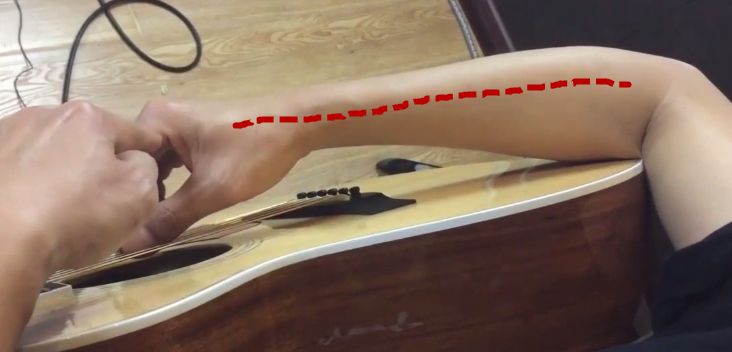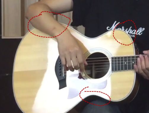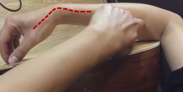 3.琴身大圆部分上侧弧度,把右臂肘关节轻轻放在上面。