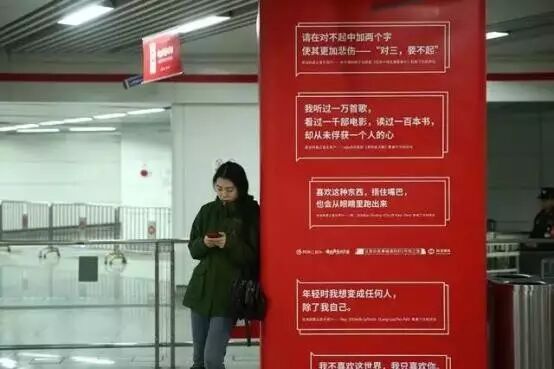今年3月20号,会玩的网易云音乐在杭州进行了一场别出心裁的营销活动。它把从5000条全站点赞数最高的乐评中,经过层层挑选的优质评论,制作成海报张贴在了杭州地铁1号线和整个江陵路地铁站上。