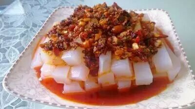 将凉水化开的绿豆淀粉倒入开水中,边倒边搅,先盛到盘中,再放入凉水中浸泡即可。拌凉粉少不了酱油、醋和芥末,放点现炸的辣椒油和芝麻酱口味更佳。